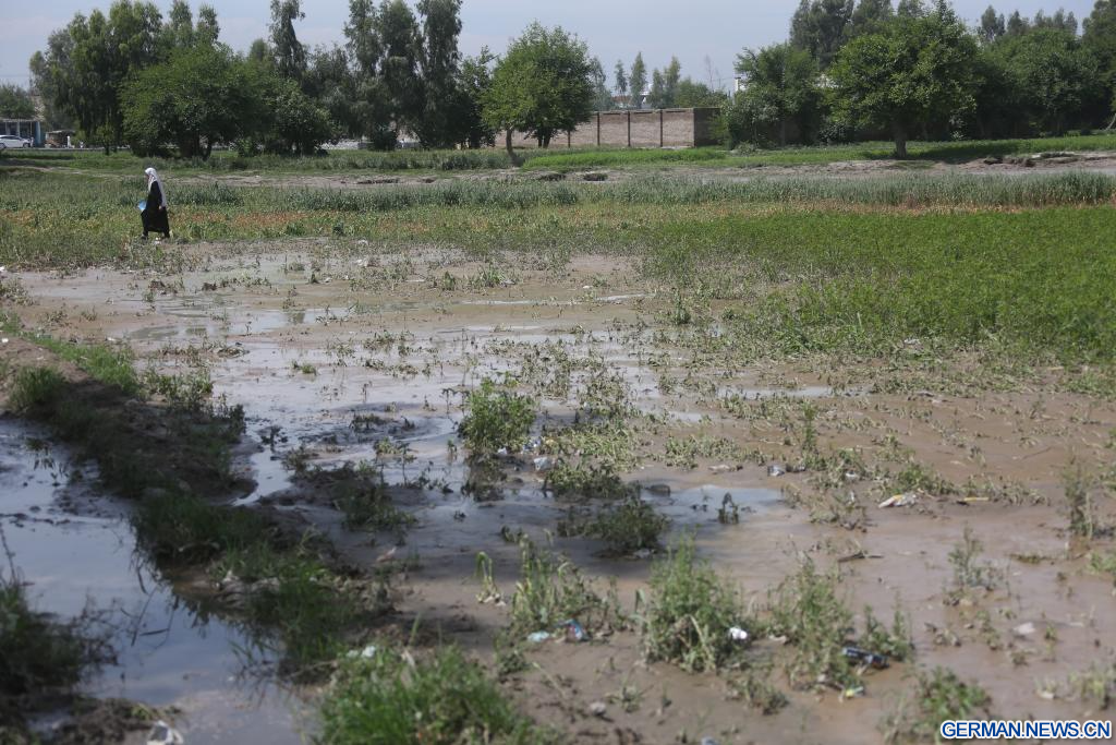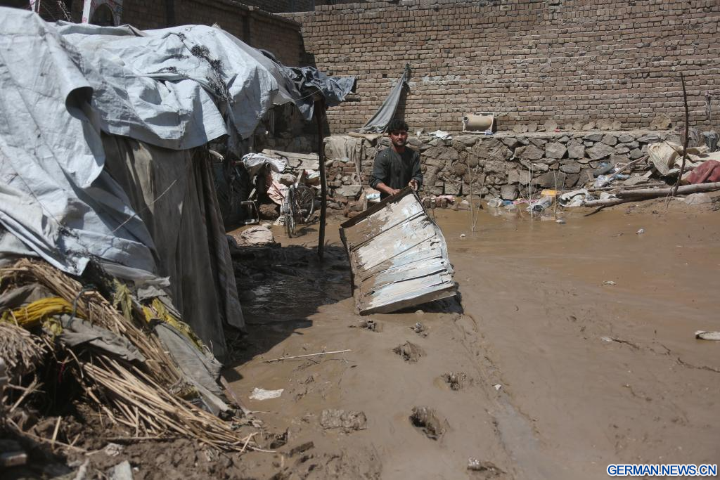 KABUL, 14. April 2026 (Xinhuanet) -- Das am 13. April 2026 aufgenommene Foto zeigt eine Szene in einem vom Hochwasser betroffenen Gebiet in der Provinz Nangarhar in Afghanistan. In den vergangenen 18 Tagen seien fast 200 Menschen durch Regenstürme und Überschwemmungen in ganz Afghanistan ums Leben gekommen, wie ein Sprecher der nationalen Katastrophenschutzbehörde des Landes mitteilte. (Foto von Saifurahman Safi/Xinhua)