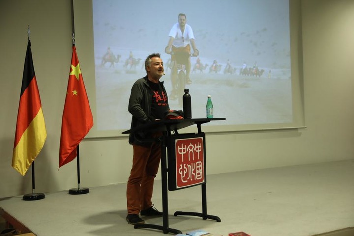 Der deutsche Reiseschriftsteller Volker Häring berichtete im Chinesischen Kulturzentrum in Berlin über seine Radtour durch China, 9. April 2026. (Xinhua/Du Zheyu)