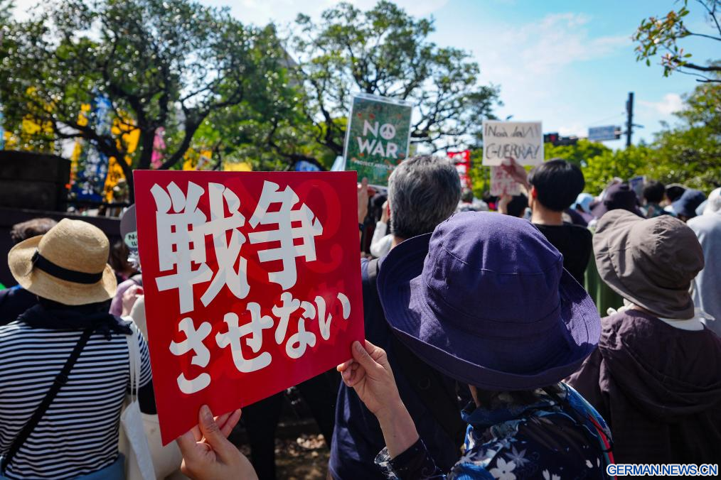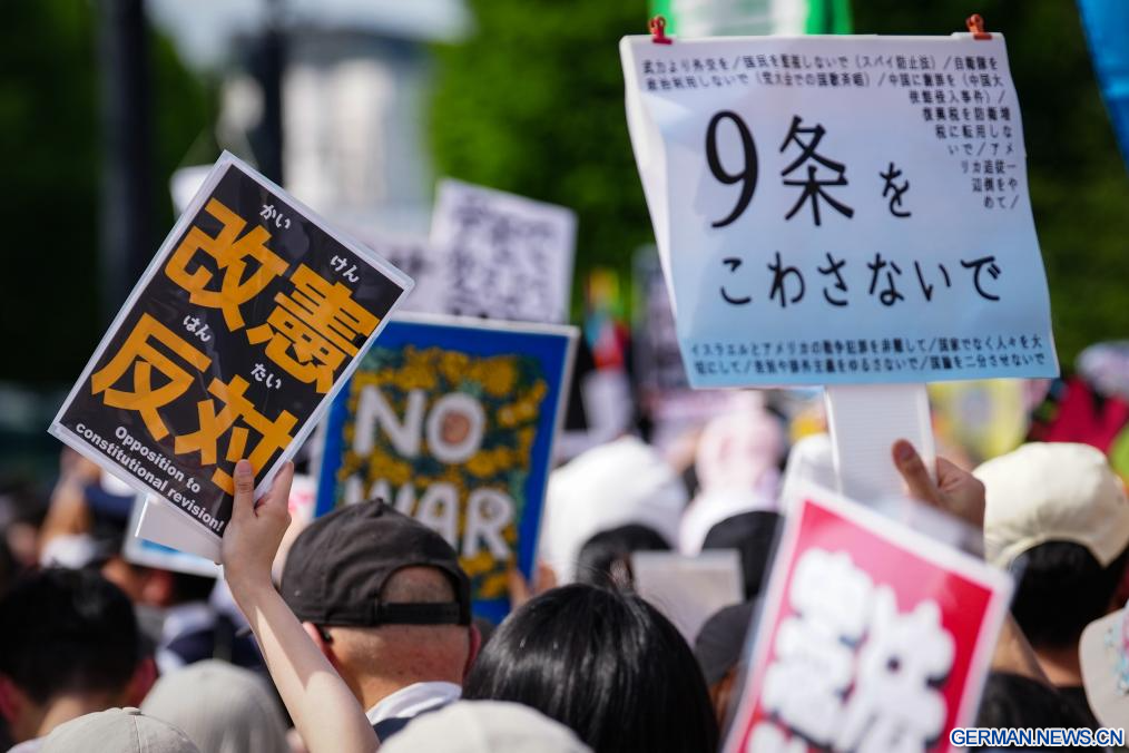 TOKIO, 19. April 2026 (Xinhuanet) -- Menschen versammeln sich um das Parlamentsgebäude in Tokio, Japan, um gegen die Versuche der Regierung von Premierministerin Sanae Takaichi zur Änderung der Friedensverfassung des Landes zu protestieren und den Schutz von Artikel 9 zu fordern, 19. April 2026.