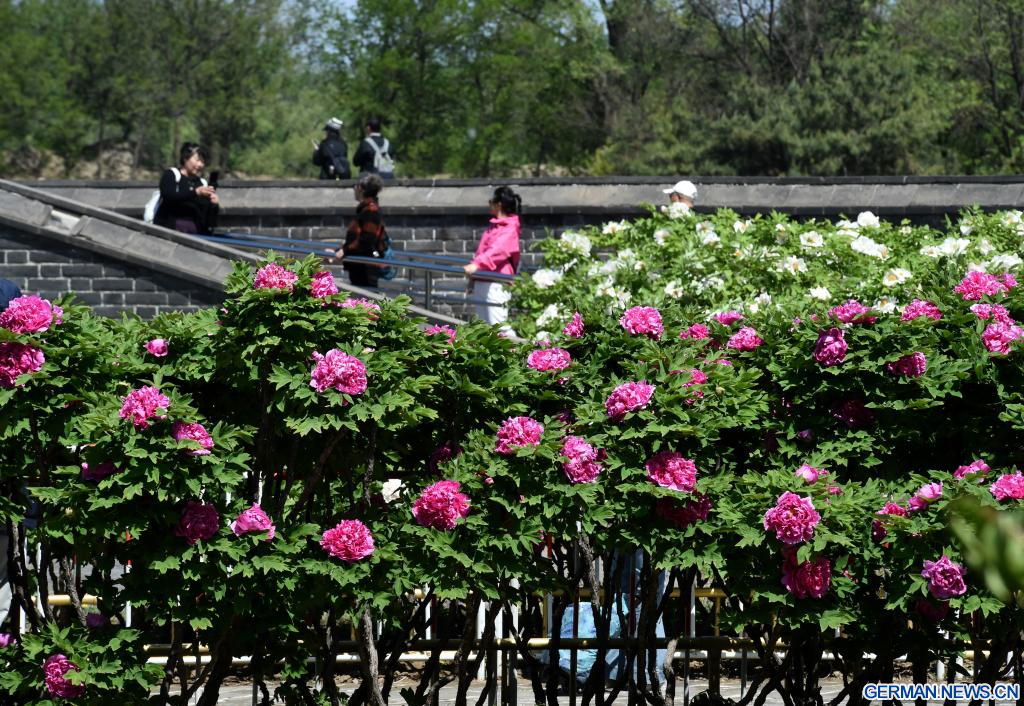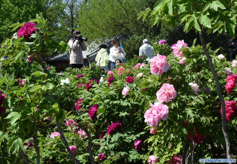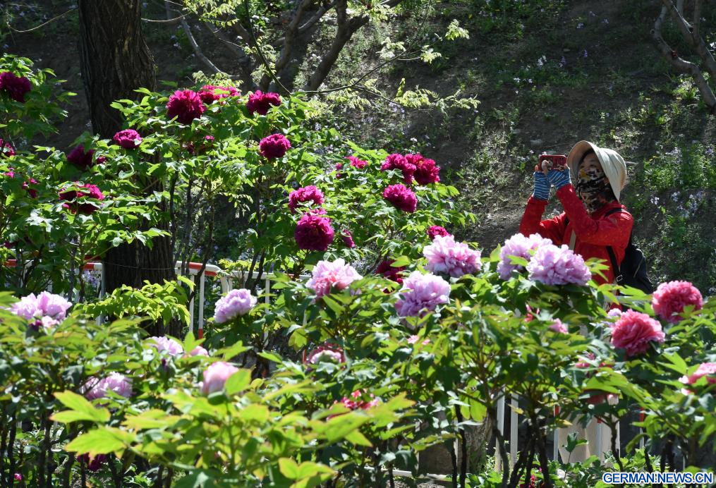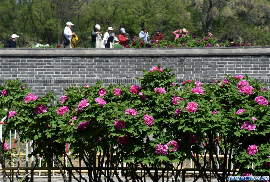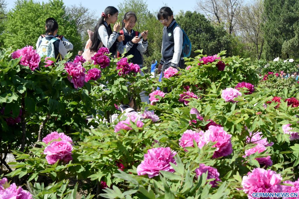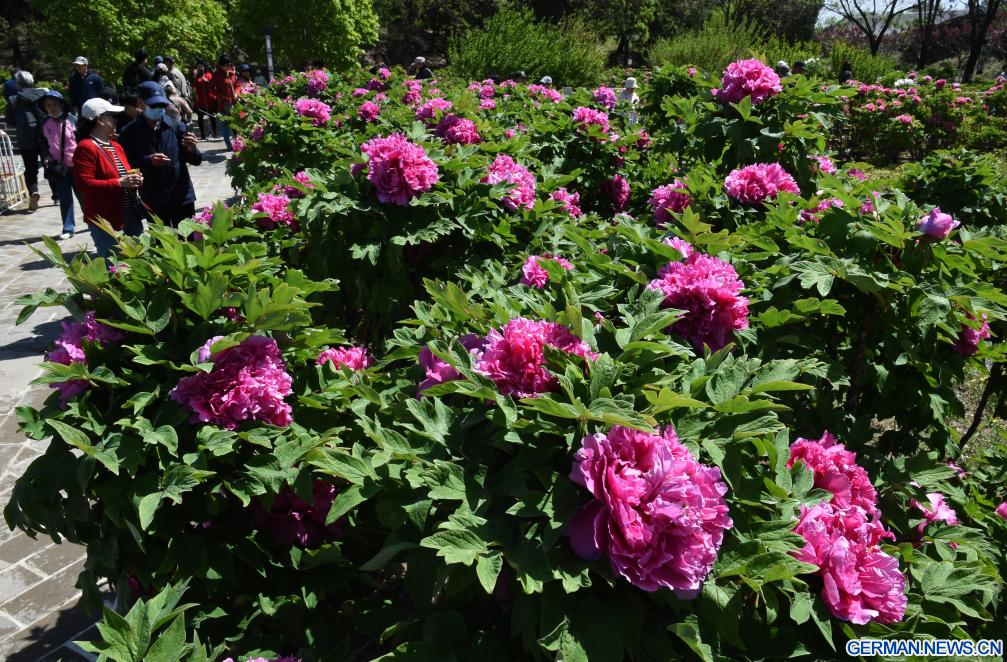 BEIJING, 20. April 2026 (Xinhuanet) -- Touristen erfreuen sich an blühenden Pfingstrosen im Yuanmingyuan-Park in der chinesischen Hauptstadt Beijing, 20. April 2026. (Quelle: Xinhua/Luo Xiaoguang)