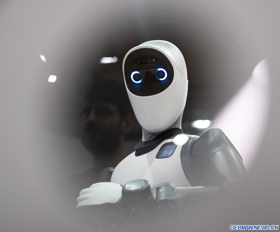 HANNOVER, 21. April 2026 (Xinhua) -- Ein Mann betrachtet einen humanoiden Roboter im Ausstellungsbereich von Agile Robots auf der Hannover Messe 2026, 20. April 2026.
