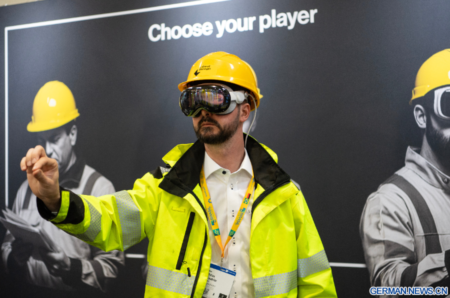 HANNOVER, 21. April 2026 (Xinhua) -- Ein Mitarbeiter demonstriert ein VR-gestütztes Produkt auf der Hannover Messe 2026, 20. April 2026.