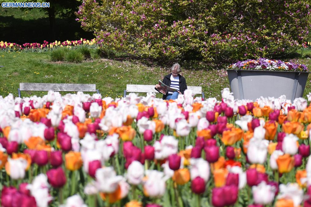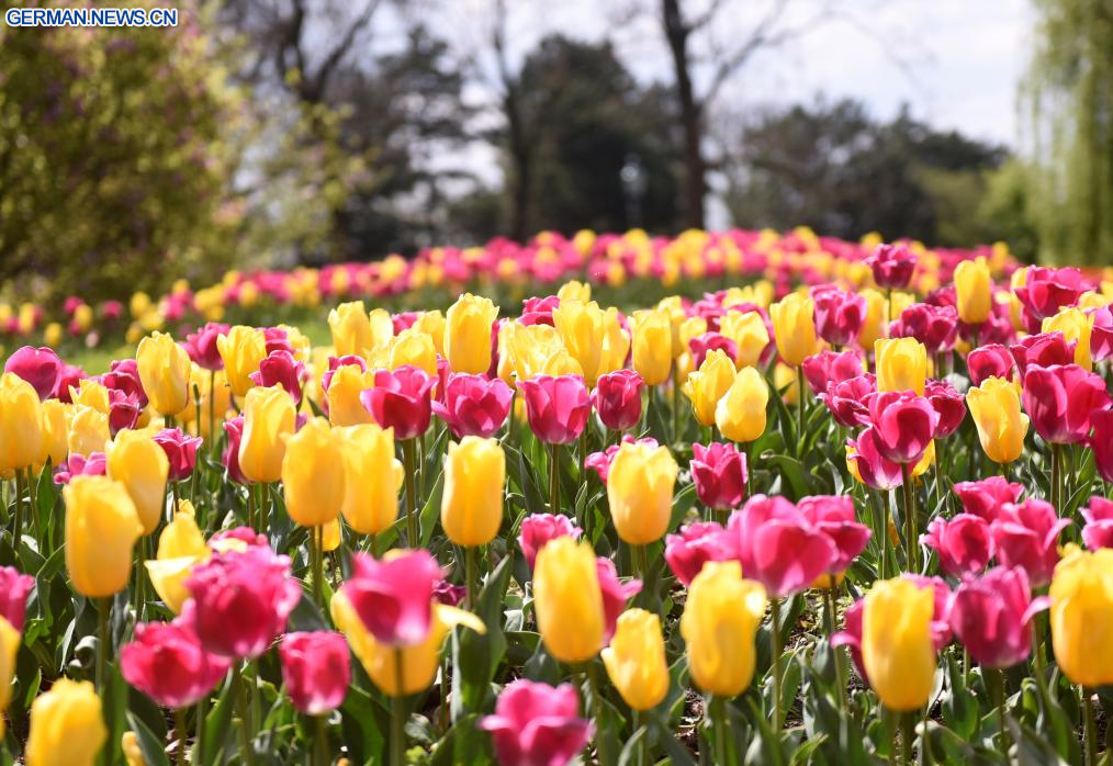 WIEN, 22. April 2026 (Xinhuanet) -- Das Foto zeigt blühende Tulpen in einem Park in Wien, Österreich, 22. April 2026. (Foto von Han Lu/Xinhua)