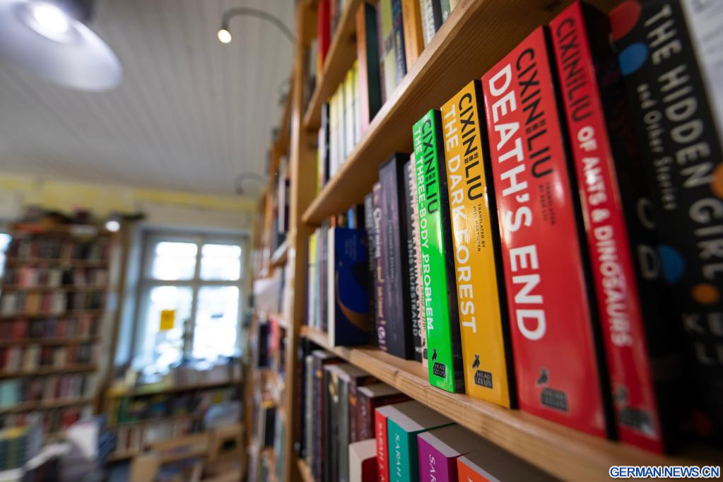 BERLIN, 23. April 2026 (Xinhuanet) -- Bücher des Science-Fiction-Autors Liu Cixin sind in Otherland, einer Buchhandlung für Science-Fiction in Berlin, Deutschland, zu sehen, 16. April 2026. (Quelle: Xinhua/Zhang Haofu)