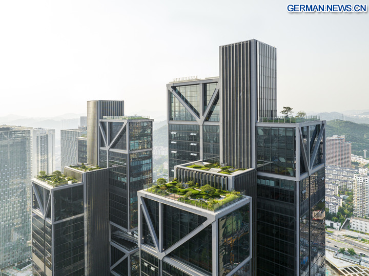 SHENZHEN, 28. September 2022 (Xinhua) -- Das Foto zeigt die Dachgärten des neuen Firmensitzes des chinesischen Drohnenherstellers DJI im Stadtbezirk Nanshan von Shenzhen in der Provinz Guangdong in Südchina, 13. September 2022. Der chinesische Drohnenhersteller DJI hat die Eröffnung seines neuen Firmensitzes namens DJI Sky City in Shenzhen bekannt gegeben. (Foto von Tian Fangfang/Xinhua)