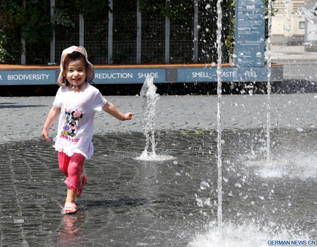 FRANKFURT, 8. Juli 2023 (Xinhuanet) -- Ein Mädchen spielt an einem Brunnen in Frankfurt, Deutschland, 8. Juli 2023. (Quelle: Xinhua/Zhang Fan)