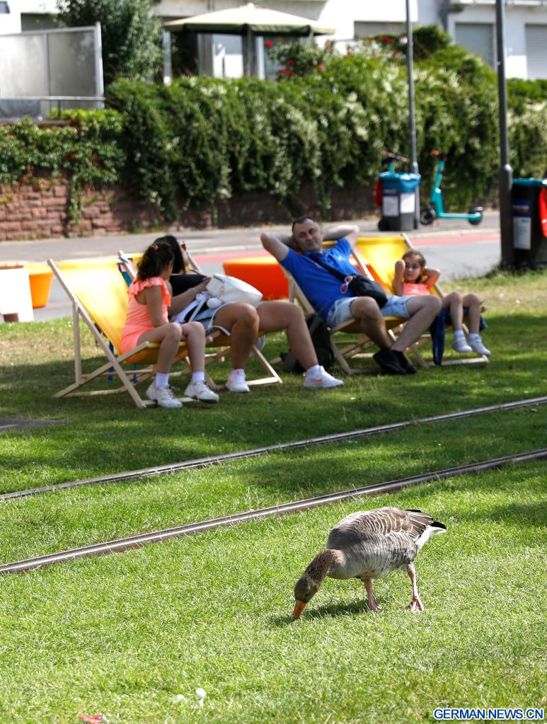 FRANKFURT, 8. Juli 2023 (Xinhuanet) -- Menschen ruhen auf dem Rasen in Frankfurt, Deutschland, 8. Juli 2023. (Quelle: Xinhua/Zhang Fan)