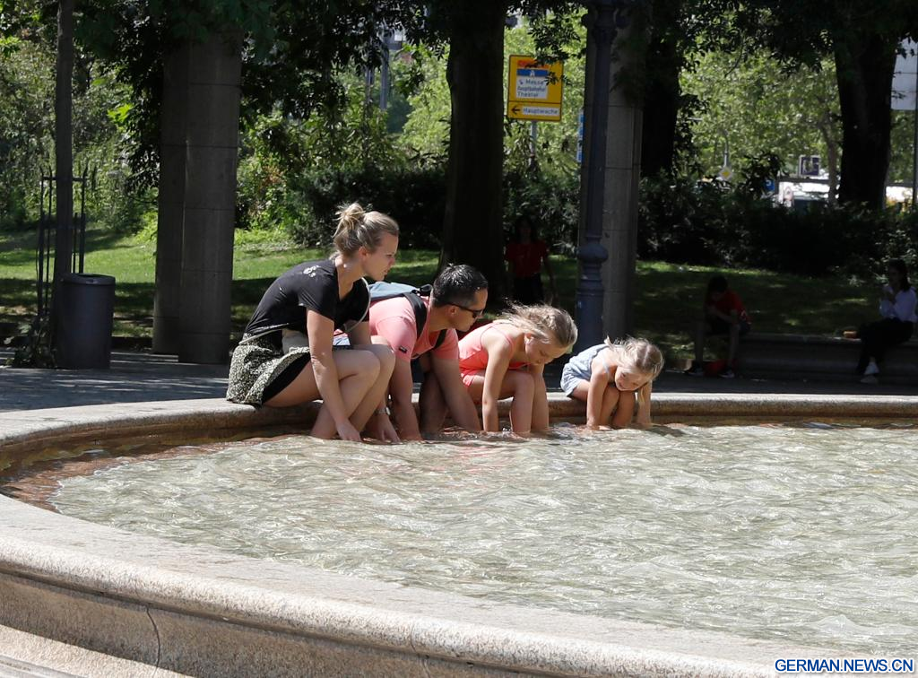 FRANKFURT, 8. Juli 2023 (Xinhuanet) -- Menschen kühlen sich an einem Brunnen in Frankfurt, Deutschland, ab, 8. Juli 2023. (Quelle: Xinhua/Zhang Fan)