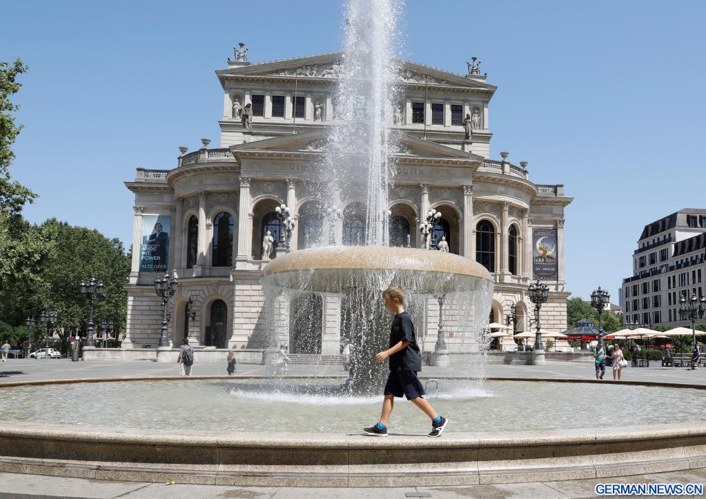FRANKFURT, 8. Juli 2023 (Xinhuanet) -- Ein Junge spielt an einem Brunnen in Frankfurt, Deutschland, 8. Juli 2023. (Quelle: Xinhua/Zhang Fan)