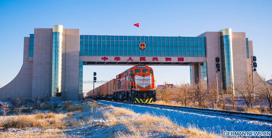 Ein China-Europa-Güterzug fährt durch das Grenztor des Grenzübergangs Erenhot im Autonomen Gebiet Innere Mongolei in Nordchina, 8. Januar 2021. (Foto von Guo Pengjie/Xinhua)
