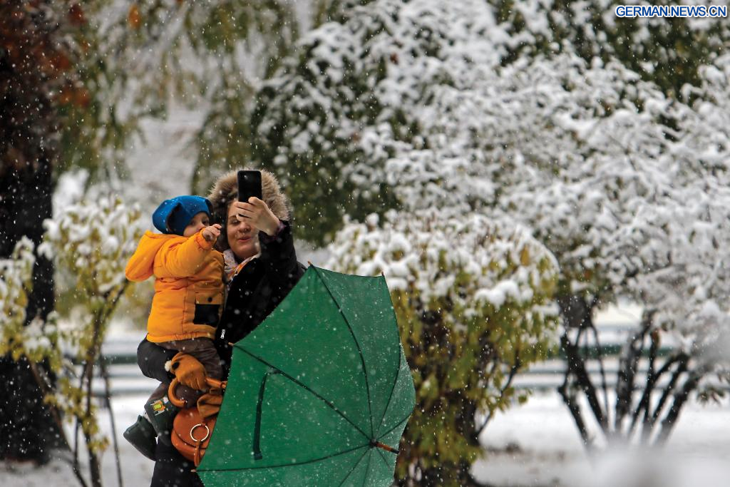 BUKAREST, 7. Dezember 2023 (Xinhuanet) -- Eine Frau, die ein Kind im Arm hält, macht ein Selfie in einem Park während eines Schneefalls in Bukarest, Rumänien, 7. Dezember 2023. Rumänien begrüßte am Donnerstag den ersten Schneefall des diesjährigen Winters. (Foto von Cristian Cristel/Xinhua)