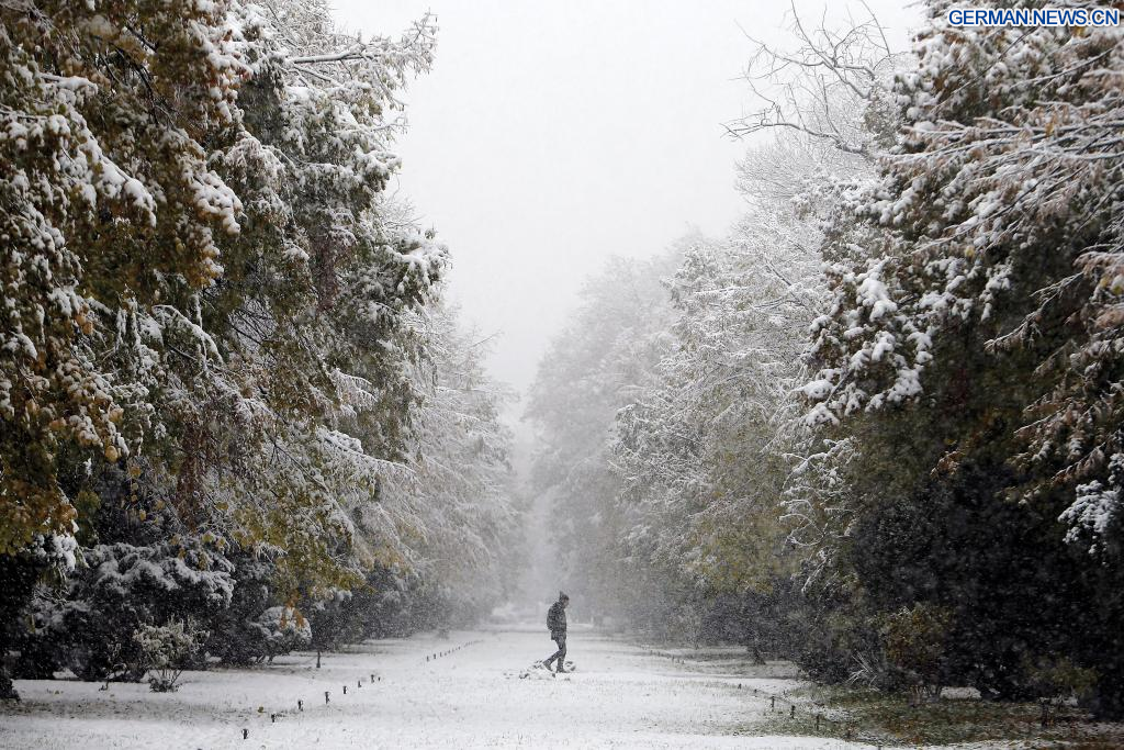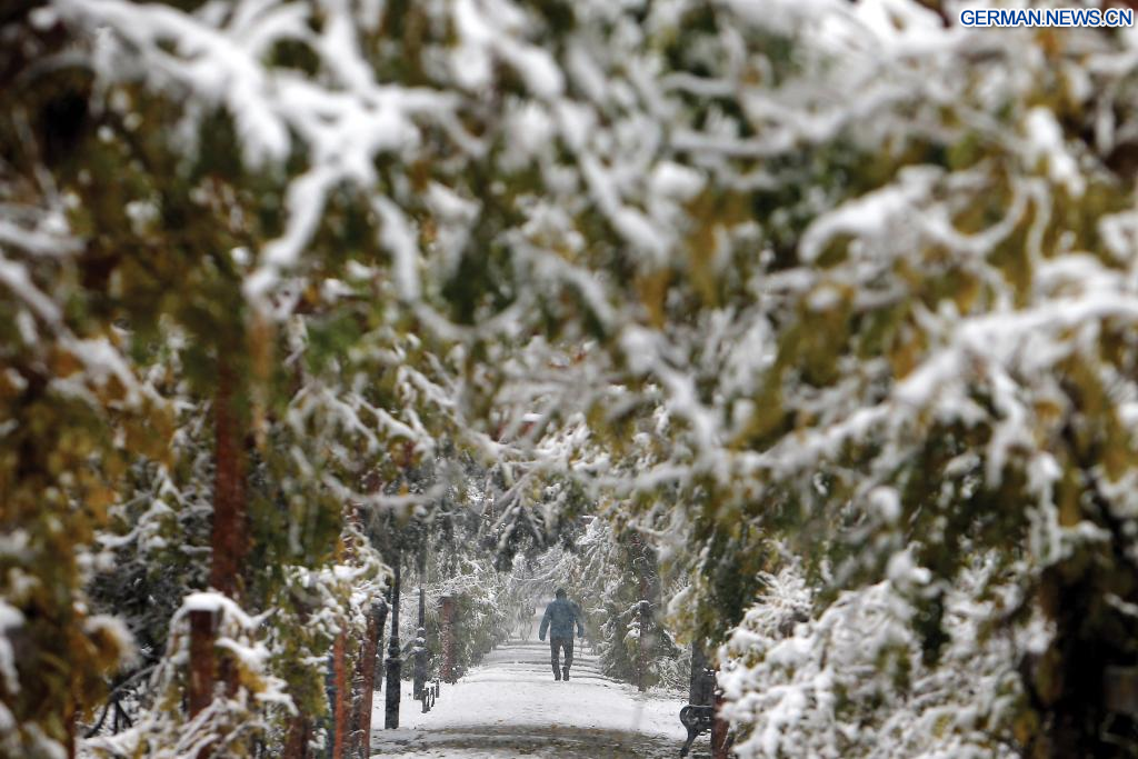 BUKAREST, 7. Dezember 2023 (Xinhuanet) -- Ein Mann geht in einem Park während eines Schneefalls in Bukarest, Rumänien, spazieren, 7. Dezember 2023. Rumänien begrüßte am Donnerstag den ersten Schneefall des diesjährigen Winters. (Foto von Cristian Cristel/Xinhua)