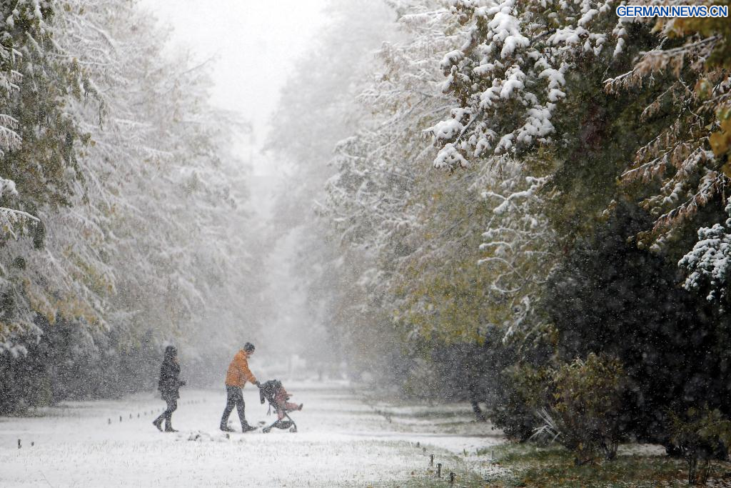 BUKAREST, 7. Dezember 2023 (Xinhuanet) -- Menschen gehen in einem Park während eines Schneefalls in Bukarest, Rumänien, 7. Dezember 2023. Rumänien begrüßte am Donnerstag den ersten Schneefall des diesjährigen Winters. (Foto von Cristian Cristel/Xinhua)