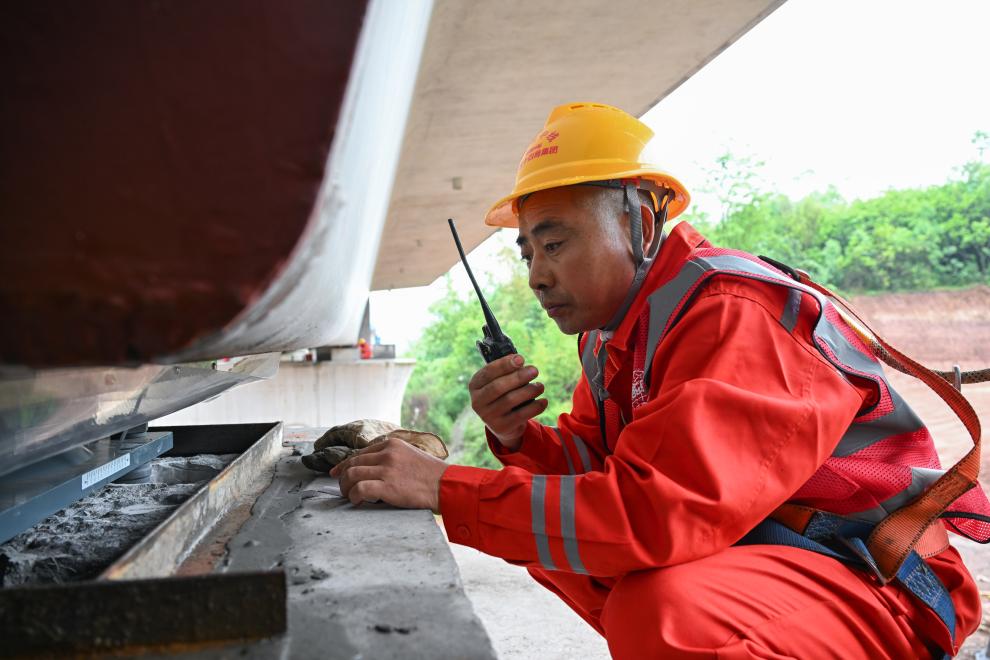 CHONGQING, 16. Mai 2025 (Xinhuanet) -- Ein Mitarbeiter überwacht den Einbau des ersten Kastenträgers des Abschnitts Dazu der Mittellinie der Eisenbahnlinie Chengdu-Chongqing auf der Baustelle im Bezirk Dazu der südwestchinesischen regierungsunmittelbaren Stadt Chongqing, 16. Mai 2025. Der erste Kastenträger mit einem Gewicht von 697 Tonnen und einer Länge von 32,6 Metern wurde am Freitag präzise aufgestellt.