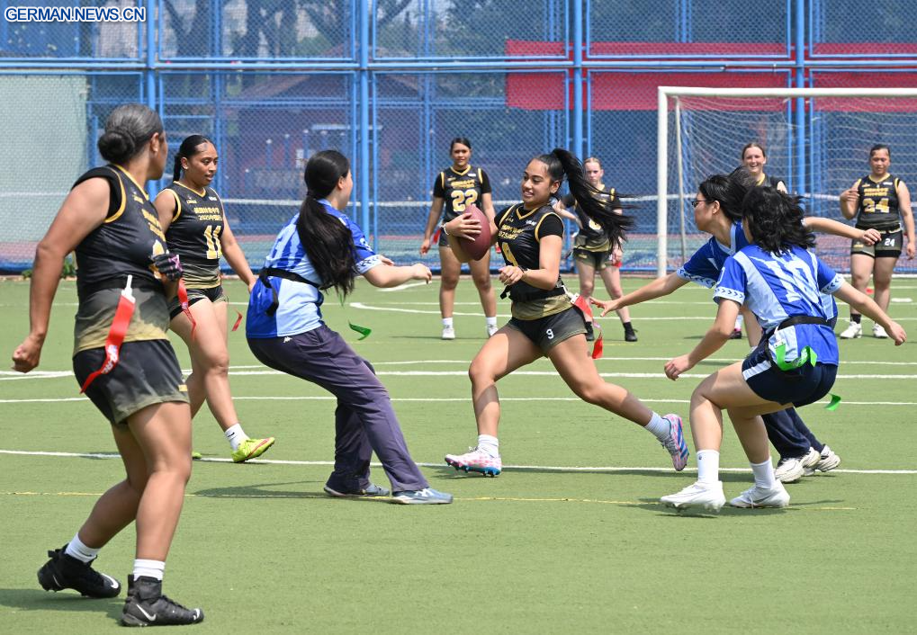 BEIJING, 26. Mai 2025 (Xinhuanet) -- Schüler der Lincoln High School und der Beijing National Day School posieren für ein Gruppenfoto während NFL FLAG China-U.S. Youth Flag Football Exchange Event & Lincoln High School 2025 China Tour in Beijing National Day School in Chinas Hauptstadt Beijing, 26. Mai 2025. (Quelle: Xinhua/Li He)