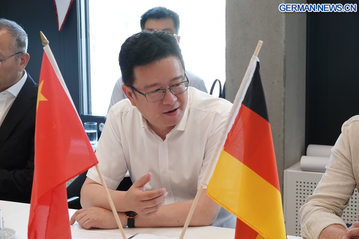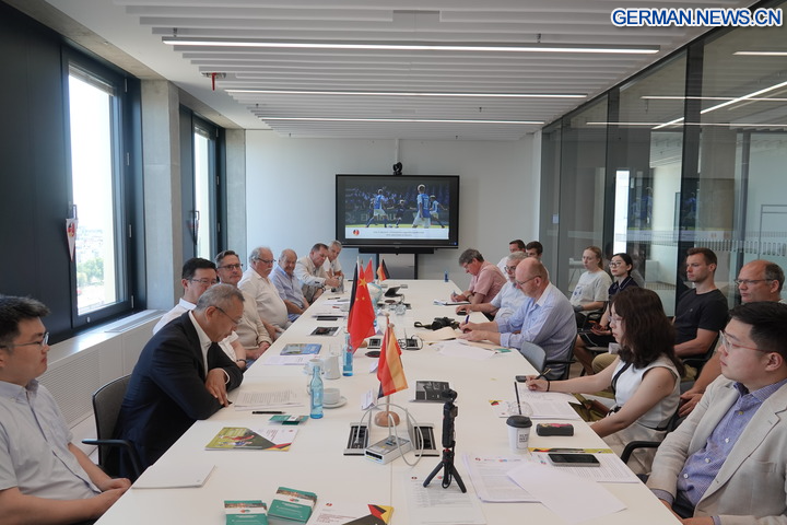 MANNHEIM, 2. Juli 2025 (Xinhua) -- Das Foto zeigt die Pressekonferenz zum 8. Deutsch-Chinesischen U16-Fußballturnier in Mannheim, 1. Juli 2025. Das Turnier wird im August in Mannheim mit voraussichtlich etwa zehn Mannschaften stattfinden, teilten die Organisatoren am Dienstag mit. (Xinhua/Tai Sicong)