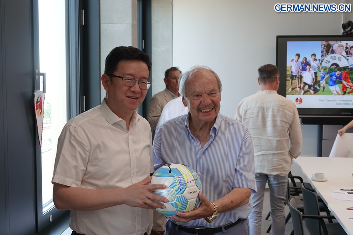MANNHEIM, 2. Juli 2025 (Xinhua) -- Huang Yiyang (links), chinesischer Generalkonsul in Frankfurt, erhält einen signierten Fußball von Klaus Schlappner, dem ersten ausländischen Cheftrainer der chinesischen Herren-Fußballnationalmannschaft, während einer Pressekonferenz zum 8. Deutsch-Chinesischen U16-Fußballturnier in Mannheim, 1. Juli 2025. Das Turnier wird im August in Mannheim mit voraussichtlich etwa zehn Mannschaften stattfinden, teilten die Organisatoren am Dienstag mit. (Xinhua/Tai Sicong)