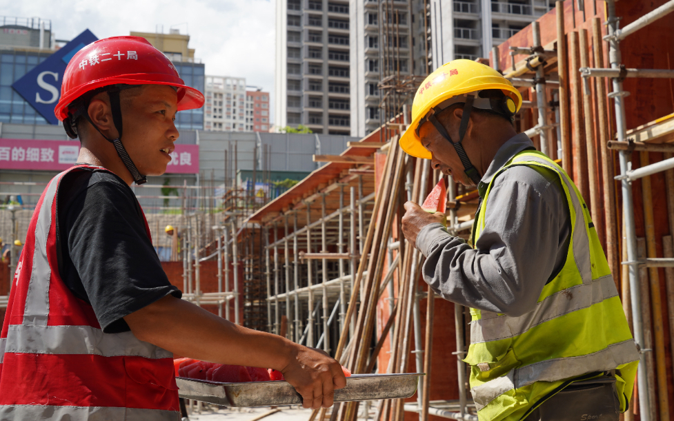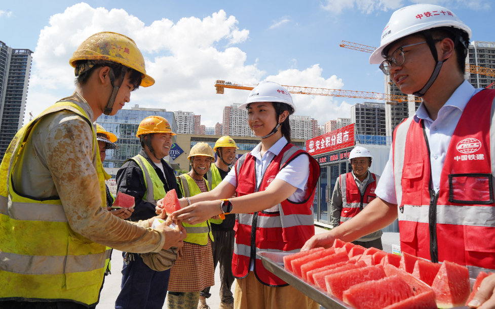 Mitarbeiter der China Railway 20th Bureau Group Co., Ltd. verteilen Wassermelonenscheiben an Bauarbeiter.