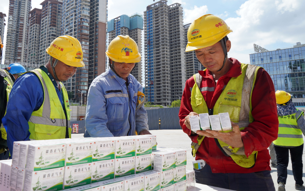 Arbeiter auf der Baustelle des Nanning Rail Transit Science and Innovation Industrial Zone Project im südchinesischen Autonomen Gebiet Guangxi der Zhuang erhalten Medikamente zur Vorbeugung von Hitzeschlägen.