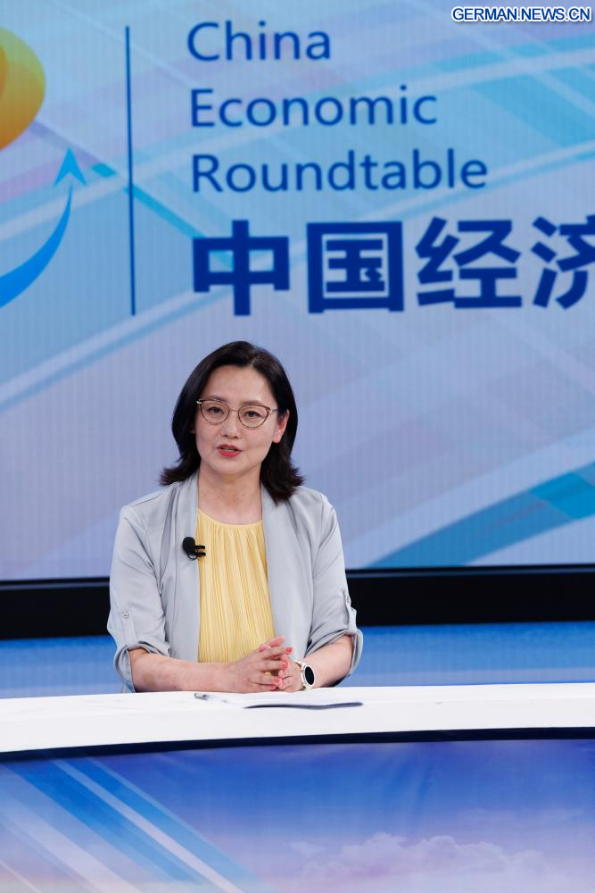 BEIJING, 14. Juli 2025 (Xinhuanet) -- Ji Xiaofeng, Beamtin bei der Abteilung für Auslandsinvestitionen des Handelsministeriums, spricht am Drehort der neuesten Folge von China Economic Roundtable, einer von der Nachrichtenagentur Xinhua veranstalteten All-Media-Talkshow. (Quelle: Xinhua/Jin Liwang)