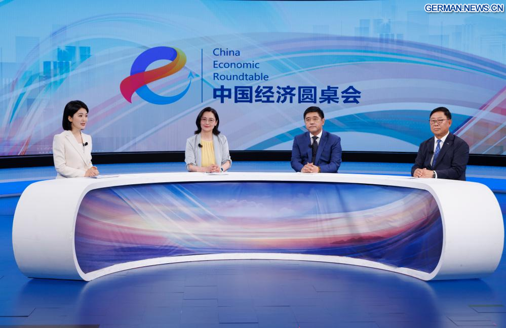 BEIJING, 14. Juli 2025 (Xinhuanet) -- Das Foto zeigt den Drehort der neuesten Folge des China Economic Roundtable, einer von der Nachrichtenagentur Xinhua veranstalteten All-Media-Talkshow. (Quelle: Xinhua/Jin Liwang)