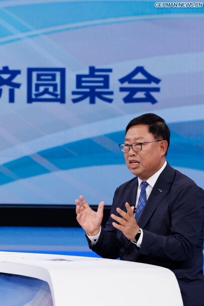 BEIJING, 14. Juli 2025 (Xinhuanet) -- Zhao Bingdi, Präsident von Panasonic China, spricht am Drehort der neuesten Folge von China Economic Roundtable, einer von der Nachrichtenagentur Xinhua veranstalteten All-Media-Talkshow. (Quelle: Xinhua/Jin Liwang)