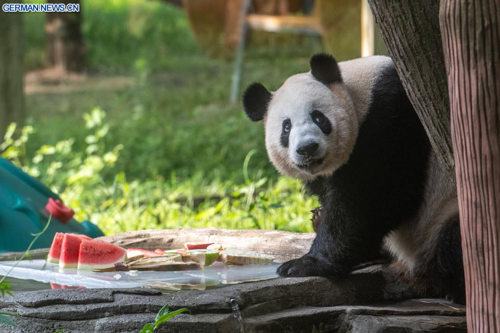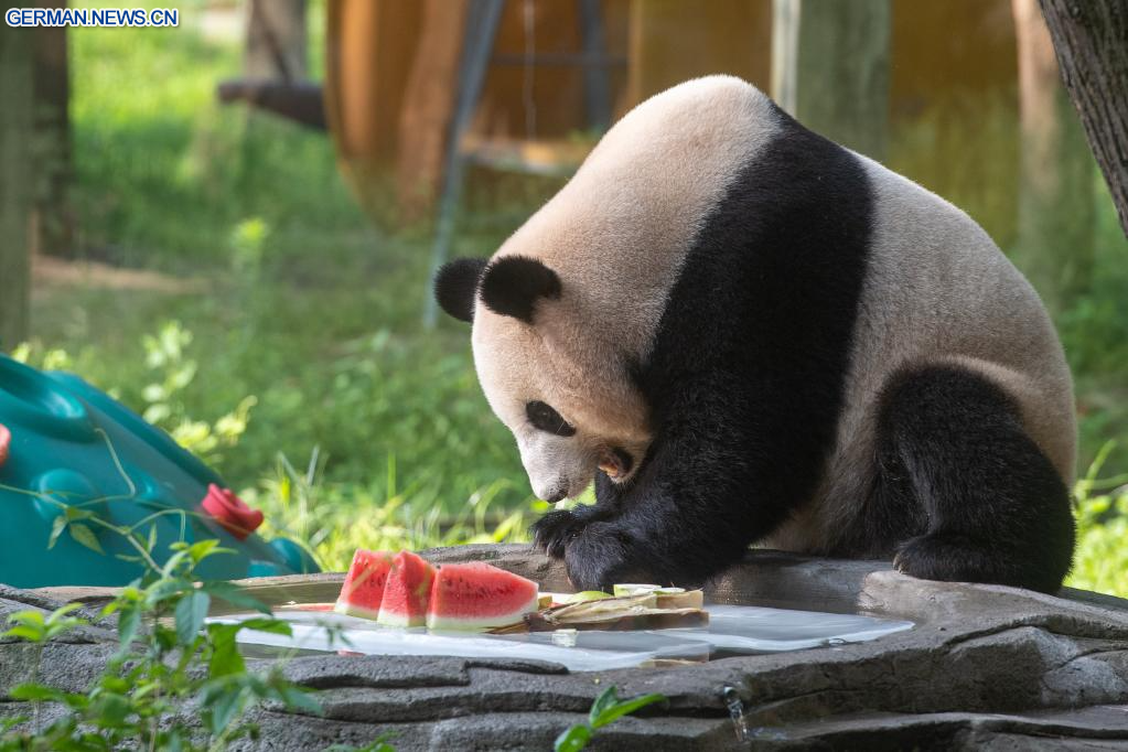CHONGQING, 16. Juli 2025 (Xinhuanet) -- Ein Riesenpanda genießt eine gekühlte Wassermelone im Zoo von Chongqing in der südwestchinesischen regierungsunmittelbaren Stadt Chongqing, 16. Juli 2025. Aufgrund der anhaltenden hohen Temperaturen in Chongqing hat der Zoo verschiedene Maßnahmen ergriffen, um den Tieren die Sommerhitze erträglicher zu machen. Dazu gehören Eisbäder, Klimaanlagen und die Fütterung der Tiere mit gekühlten Leckereien, um ihre Sicherheit und ihr Wohlbefinden während der gesamten Saison zu gewährleisten. (Quelle: Xinhua/Tang Yi)