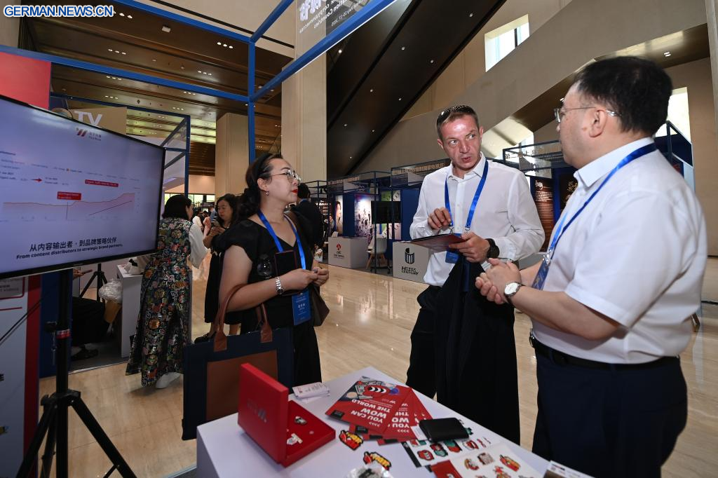XI'AN, 16. Juli 2025 (Xinhuanet) -- Vertreter besuchen den Stand von YoyWow während des 2. Fernsehfestivals der Länder der Shanghaier Organisation für Zusammenarbeit (SOZ) in Xi'an in der nordwestchinesischen Provinz Shaanxi, 16. Juli 2025. Das Festival wurde hier am Mittwoch eröffnet. Rund 300 Vertreter aus den Mitgliedsstaaten, den Beobachterstaaten und den Dialogpartnern der SOZ nahmen an der Eröffnungszeremonie teil. (Quelle: Xinhua/Li Yibo)