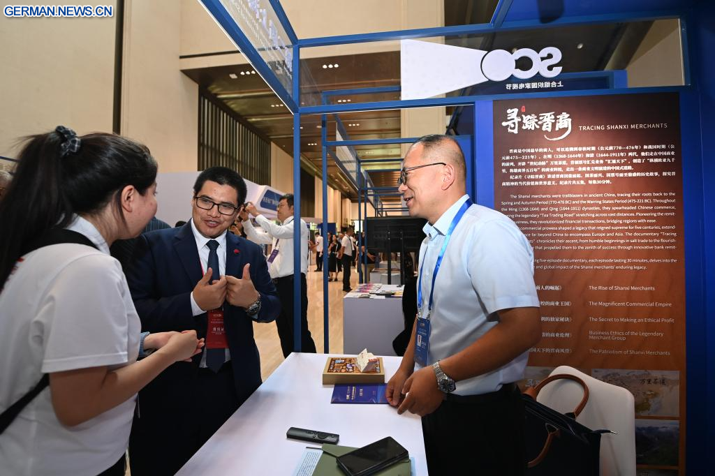 XI'AN, 16. Juli 2025 (Xinhuanet) -- Vertreter informieren sich über die audiovisuellen Produkte des Radio- und Fernsehsenders Shanxi während des 2. Fernsehfestivals der Länder der Shanghaier Organisation für Zusammenarbeit (SOZ) in Xi'an in der nordwestchinesischen Provinz Shaanxi, 16. Juli 2025. Das Festival wurde hier am Mittwoch eröffnet. Rund 300 Vertreter aus den Mitgliedsstaaten, den Beobachterstaaten und den Dialogpartnern der SOZ nahmen an der Eröffnungszeremonie teil. (Quelle: Xinhua/Li Yibo)