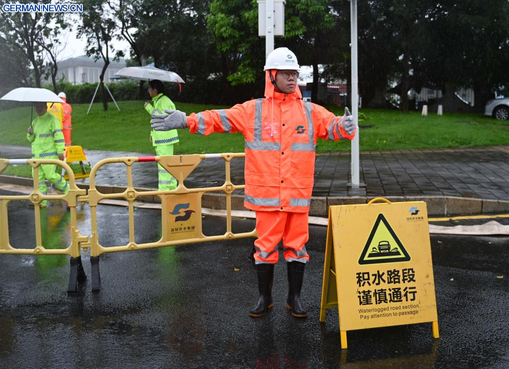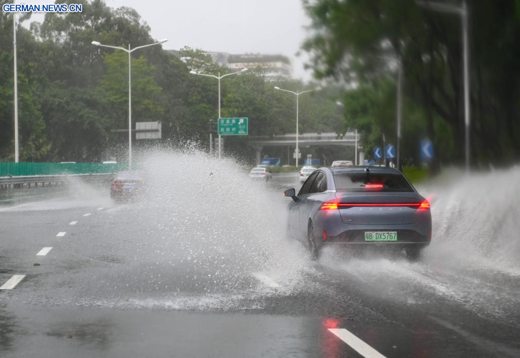 SHENZHEN, 20. Juli 2025 (Xinhuanet) -- Ein Fahrzeug fährt durch ein überschwemmtes Gebiet in Shenzhen in der südchinesischen Provinz Guangdong, 20. Juli 2025. Der Taifun Wipha, der sechste Taifun des Jahres, traf laut der Wetterwarte der Provinz Guangdong am Sonntag gegen 17:50 Uhr in der Nähe der Stadt Jiangmen in der südchinesischen Provinz Guangdong auf Land.