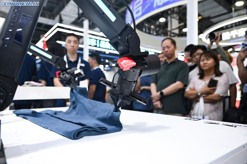 SHANGHAI, 28. Juli 2025 (Xinhuanet) -- Ein Roboter demonstriert das Falten von Kleidung auf der Welt-KI-Konferenz 2025 in Shanghai, Ostchina, 28. Juli 2025. (Quelle: Xinhua/Chen Haoming)