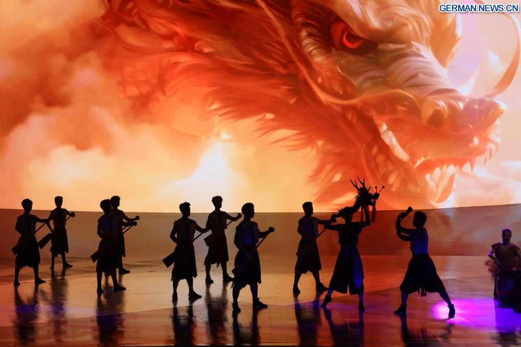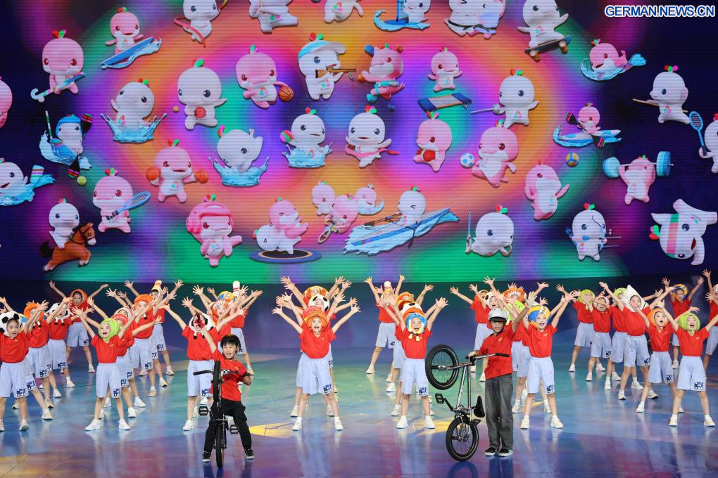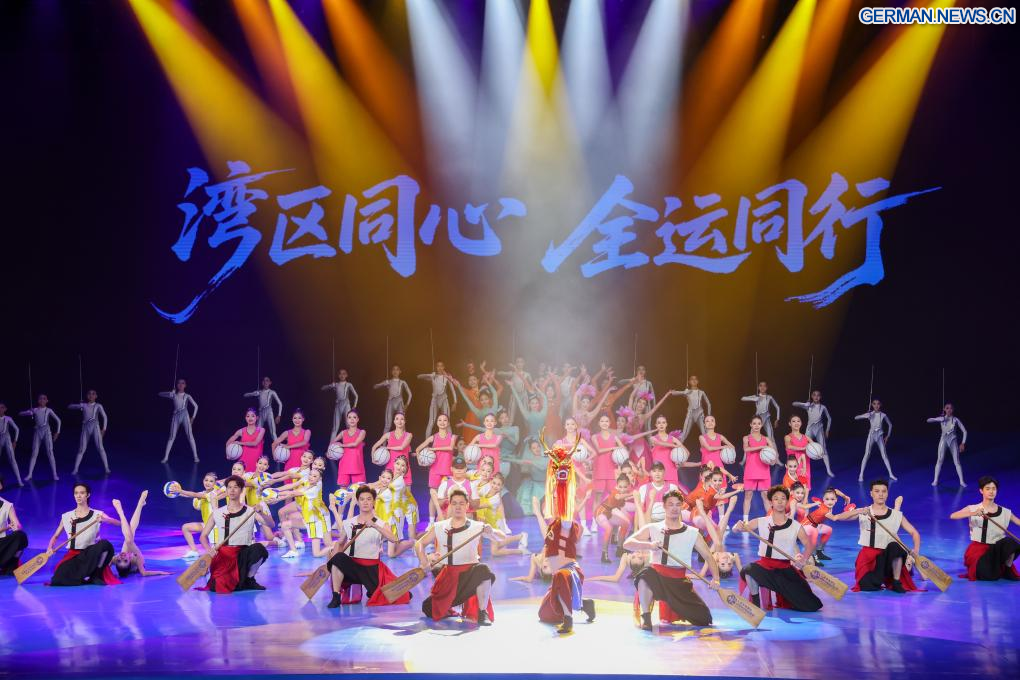 SHENZHEN, 2. August 2025 (Xinhuanet) -- Das Foto vom 2. August 2025 zeigt die Aufführung bei der Zeremonie zum 100-Tage-Countdown für den Start der 15. Nationalen Spiele und der 12. Nationalen Paralympischen Spiele Chinas sowie der 9. National Special Olympics Games in Shenzhen in der südchinesischen Provinz Guangdong. (Quelle: Xinhua/Liang Xu)