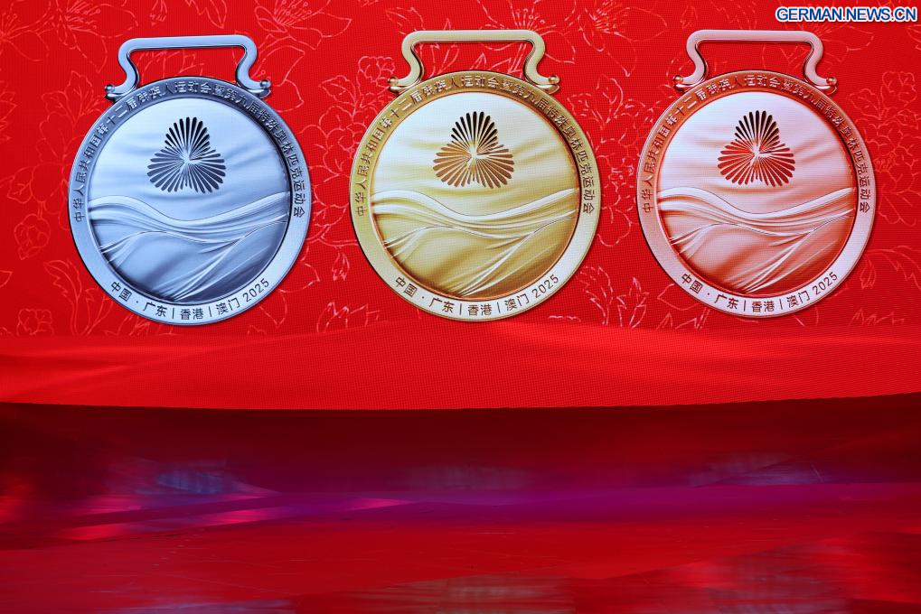 SHENZHEN, 2. August 2025 (Xinhuanet) -- Das Foto vom 2. August 2025 zeigt die Medaillen für die 12. Nationalen Paralympischen Spiele Chinas sowie die 9. National Special Olympics Games in Shenzhen in der südchinesischen Provinz Guangdong. (Quelle: Xinhua/Liang Xu)