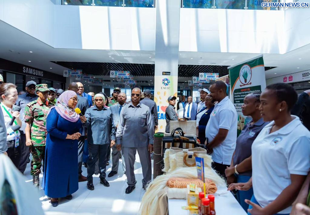DAR ES SALAAM, 3. August 2025 (Xinhuanet) -- Die tansanische Präsidentin Samia Suluhu Hassan besucht einen Ausstellungsstand während der Eröffnungsfeier des East Africa Commercial and Logistics Center (EACLC) in Dar es Salaam, Tansania, 1. August 2025. (Quelle: Xinhua/Emmanuel Herman)