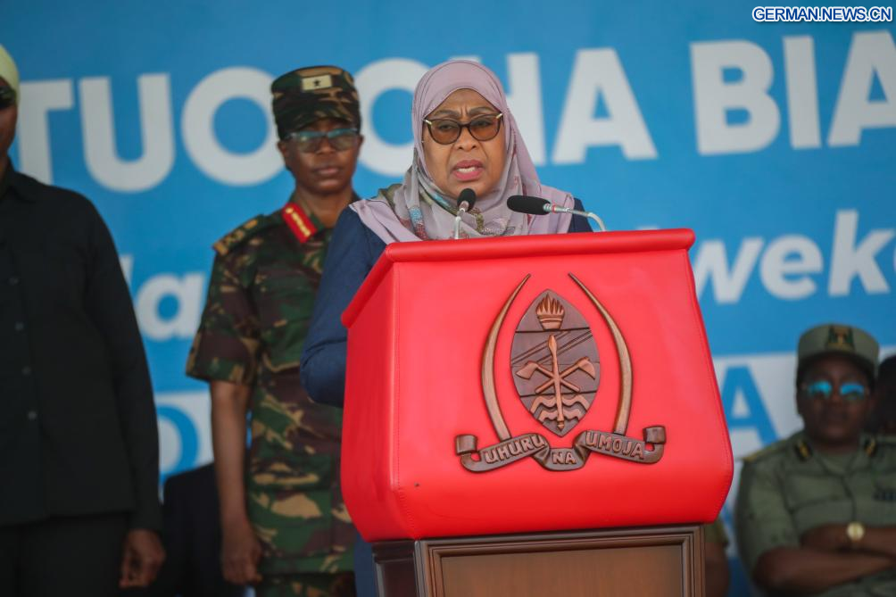 DAR ES SALAAM, 3. August 2025 (Xinhuanet) -- Die tansanische Präsidentin Samia Suluhu Hassan hält eine Rede bei der Eröffnungsfeier des East Africa Commercial and Logistics Center (EACLC) in Dar es Salaam, Tansania, 1. August 2025. Hassan hat am Freitag das EACLC offiziell für eröffnet erklärt, einen transformativen Handels- und Logistikkomplex, der vom chinesischen Unternehmen EACLC LIMITED entwickelt wurde. (Quelle: Xinhua/Emmanuel Herman)