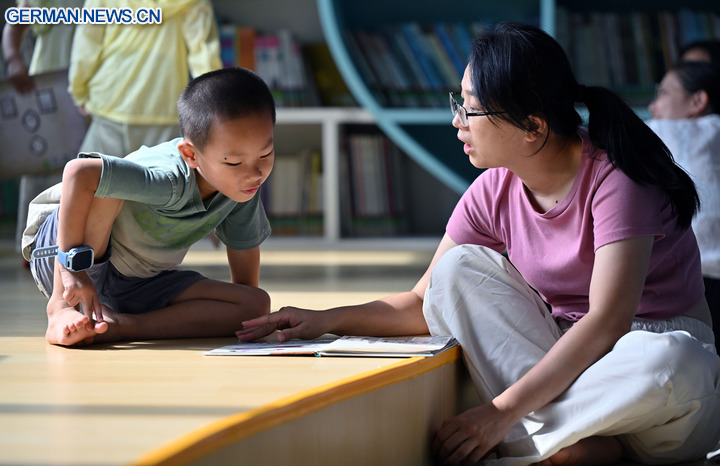BEIJING, 4. August 2025 (Xinhua) -- Eine Mutter liest mit ihrem Kind in einer Bibliothek in Haikou in der Provinz Hainan in Südchina, 3. August 2025. (Xinhua/Guo Cheng)