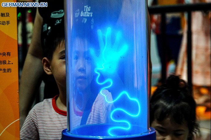BEIJING, 4. August 2025 (Xinhua) -- Ein Kind beschäftigt sich mit einer Installation in einem Museum für Wissenschaft und Technologie in Nanning im Autonomen Gebiet Guangxi der Zhuang-Nationalität in Südchina, 2. August 2025. (Foto von Yu Xiangquan/Xinhua)