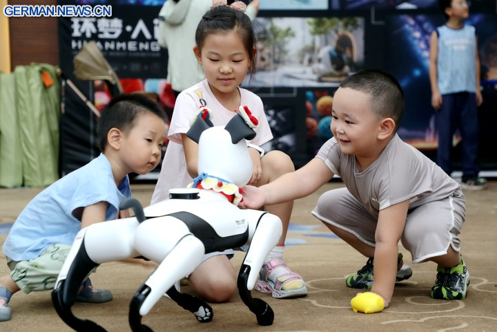 BEIJING, 4. August 2025 (Xinhua) -- Kinder beschäftigen sich mit einem Roboterhund bei einer KI-Ausstellung in Dongying in der Provinz Shandong in Ostchina, 3. August 2025. (Foto von Liu Zhifeng/Xinhua)