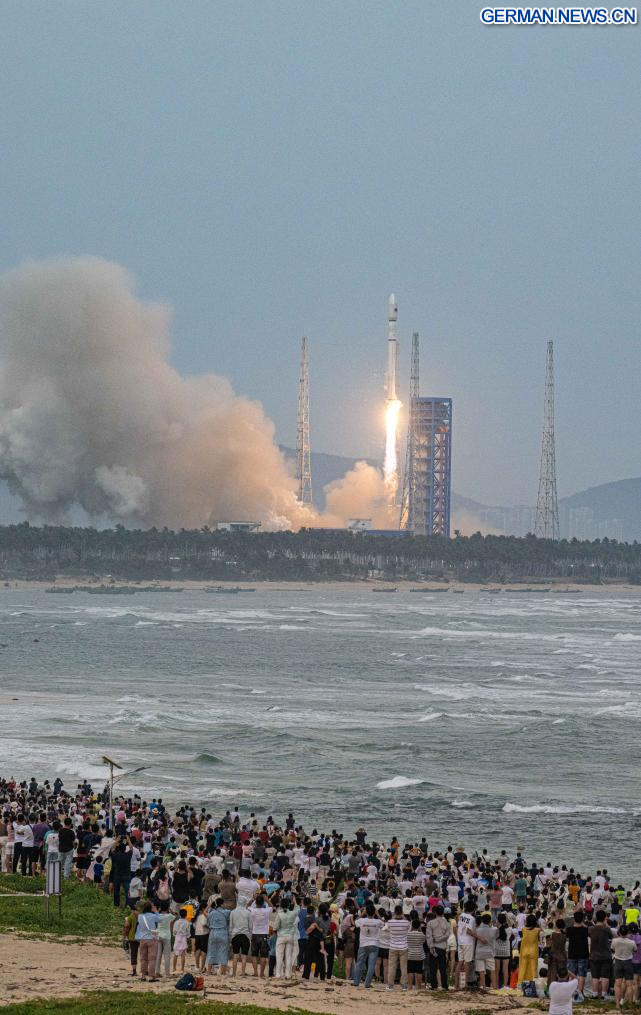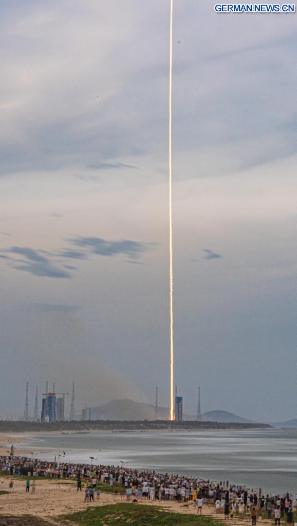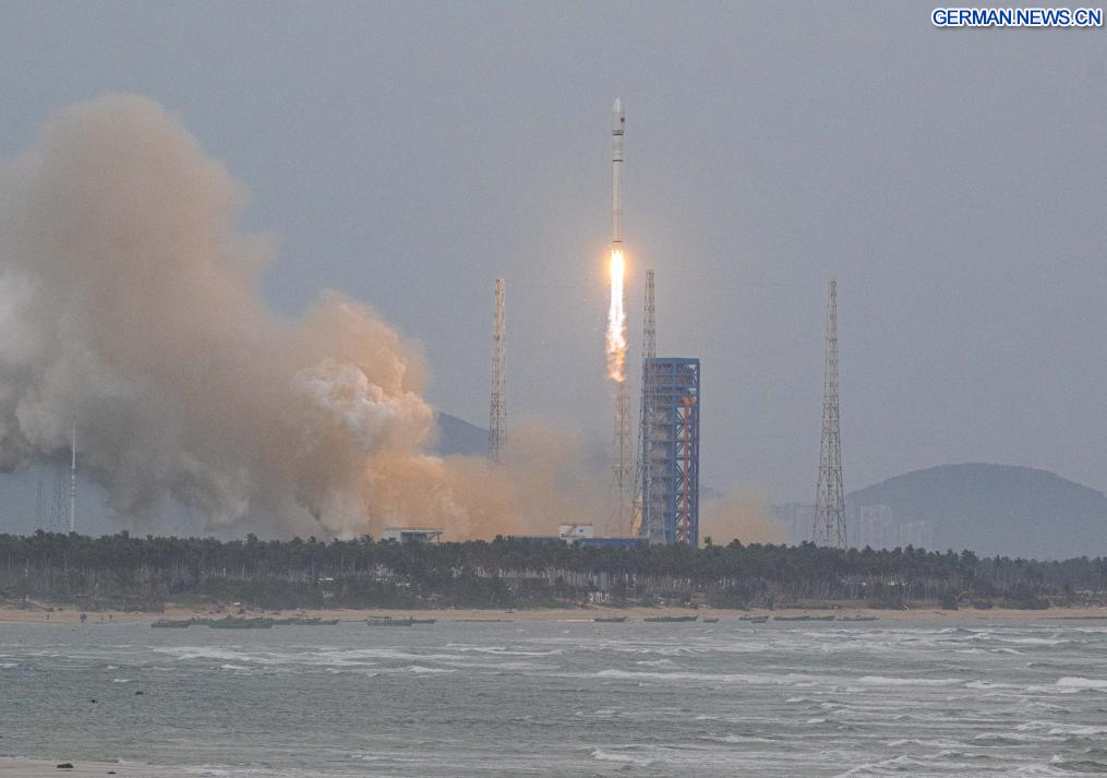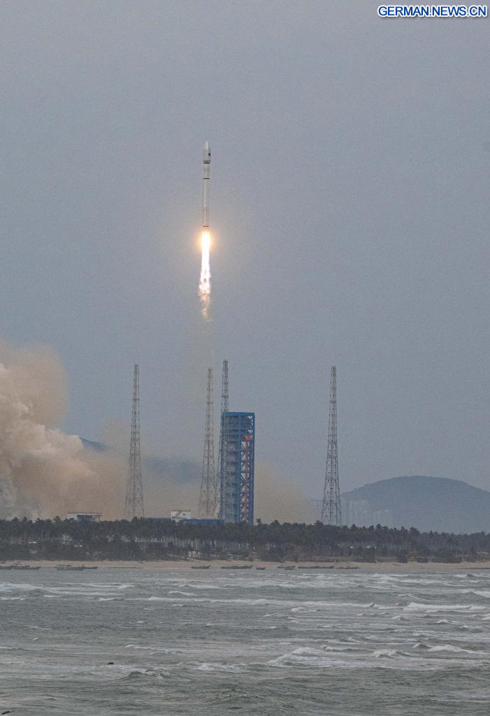 WENCHANG, 4. August 2025 (Xinhuanet) -- Eine Trägerrakete vom Typ „Langer Marsch-12“ mit einer Gruppe von Internet-Satelliten an Bord hebt vom kommerziellen Weltraumbahnhof Hainan in der südchinesischen Provinz Hainan ab, 4. August 2025. Die Rakete hob um 18:21 Uhr vom kommerziellen Weltraumbahnhof Hainan in der südlichen Inselprovinz Hainan ab. Sie brachte die Nutzlast, die siebte Gruppe von Internet-Satelliten in niedriger Umlaufbahn, erfolgreich in die vorgegebene Umlaufbahn. (Quelle: Xinhua/Pu Xiaoxu)