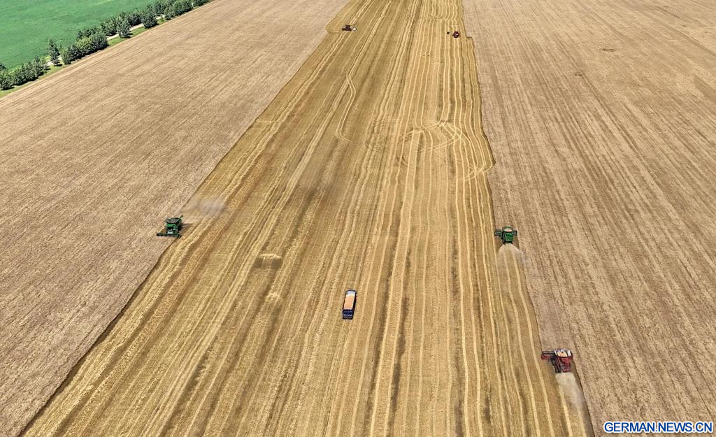 HARBIN, 5. August 2025 (Xinhuanet) -- Mähdrescher ernten Weizen auf einem Feld in der Stadt Heihe in der nordostchinesischen Provinz Heilongjiang, 5. August 2025. In der Provinz Heilongjiang, einer bedeutenden Agrarregion, die auch als „Getreidescheune Chinas“ bezeichnet wird, haben die Feldfrüchte die Reifephase erreicht. (Foto von Lu Wenxiang/Xinhua)