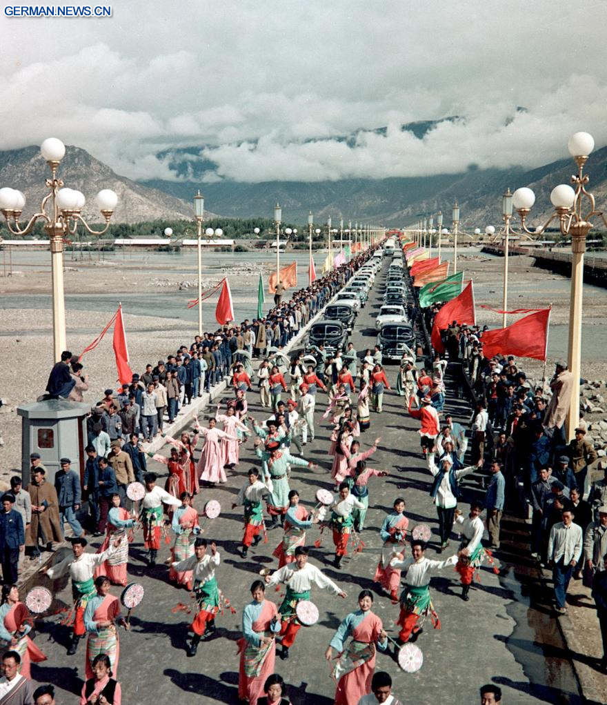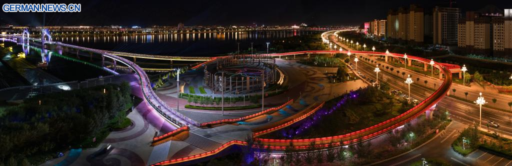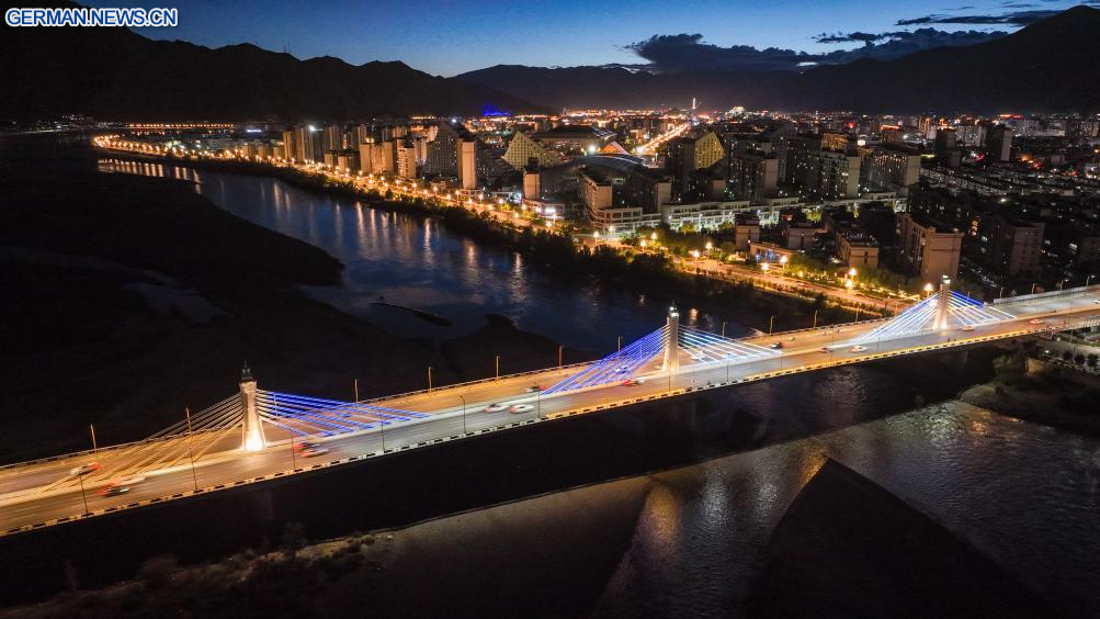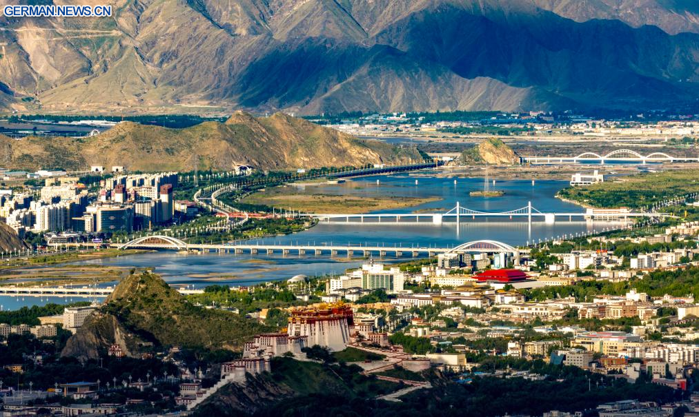 LHASA, 5. August 2025 (Xinhuanet) -- Brücken über den Lhasa-Fluss in Lhasa im südwestchinesischen Autonomen Gebiet Xizang, 1. August 2025. In den 1950er Jahren wurde die erste Brücke über den Lhasa-Fluss gebaut, wodurch die Abhängigkeit von Schafsfellflößen für die Überquerung des Flusses beendet wurde. Heute überspannen mehrere Brücken den Fluss in der Innenstadt von Lhasa, was den raschen Fortschritt des Gebiets in den Bereichen Verkehr und Stadtentwicklung widerspiegelt. (Quelle: Xinhua/Jiang Fan)