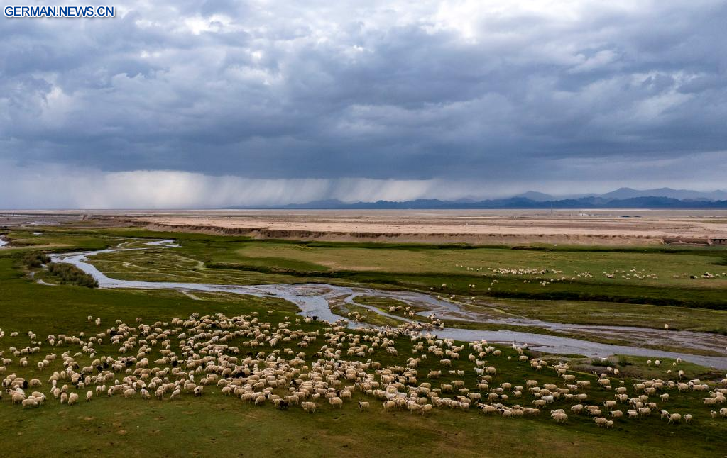 BEIJING, 5. August 2025 (Xinhuanet) -- Die Luftaufnahme einer Drohne zeigt Schafe, die auf der Sommerweide grasen, während in der Ferne Regen fällt, im Kasachischen Autonomen Kreis Akshay in der nordwestchinesischen Provinz Gansu, 12. Juli 2025. (Foto von Gao Hongshan/Xinhua)