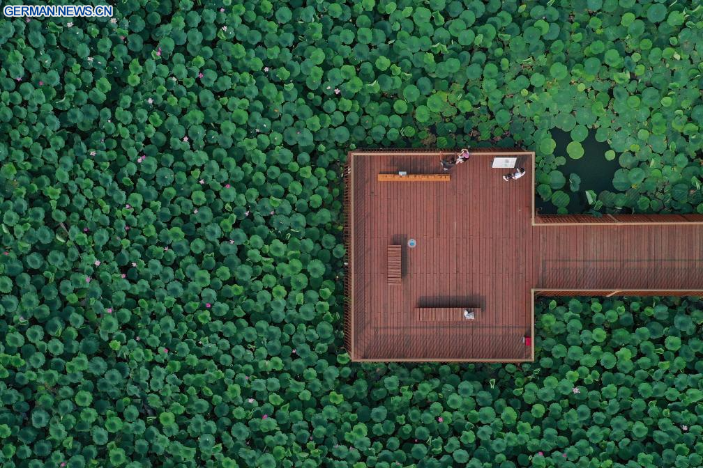 BEIJING, 5. August 2025 (Xinhuanet) -- Die Luftaufnahme einer Drohne vom 10. Juli 2025 zeigt Menschen, die die Lotusblumen im Xuanwu-See in Nanjing in der ostchinesischen Provinz Jiangsu genießen. (Foto von Xin Yi/Xinhua)