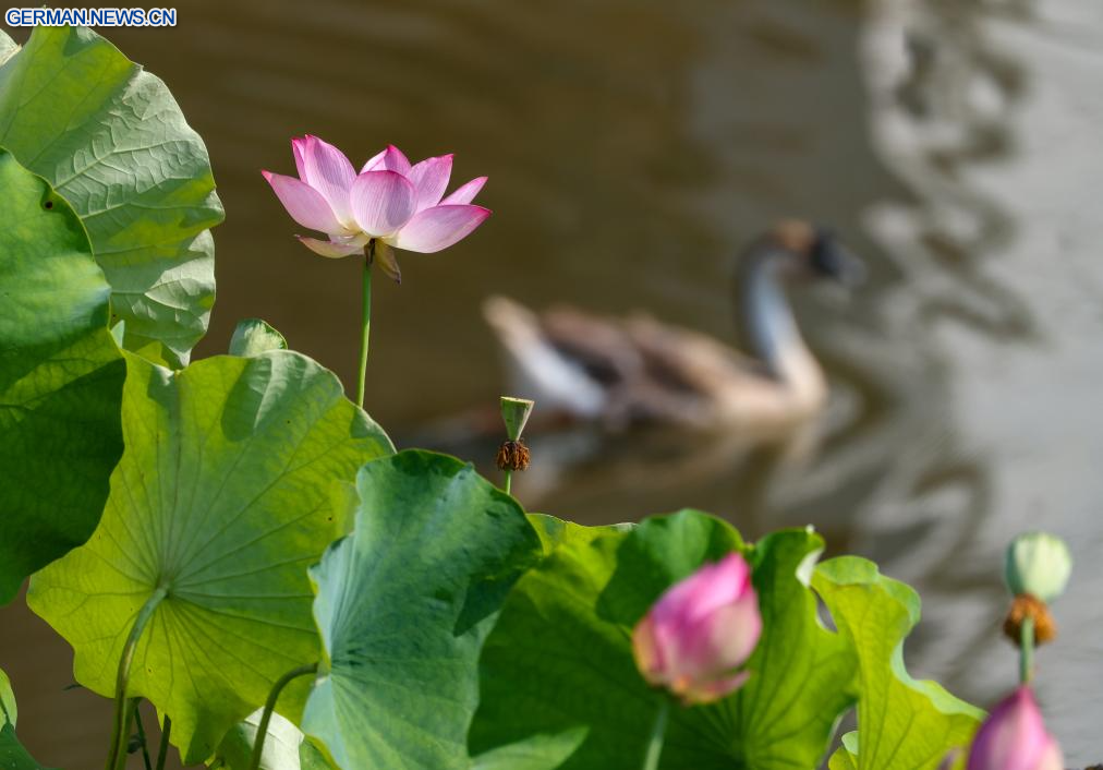 BEIJING, 5. August 2025 (Xinhuanet) -- Eine Gans geht an Lotusblumen im Dorf Paomulong im Unterbezirk Zaojiaoping in Yuping in der südwestchinesischen Provinz Guizhou vorbei, 7. Juli 2025. (Foto von Hu Panxue/Xinhua)