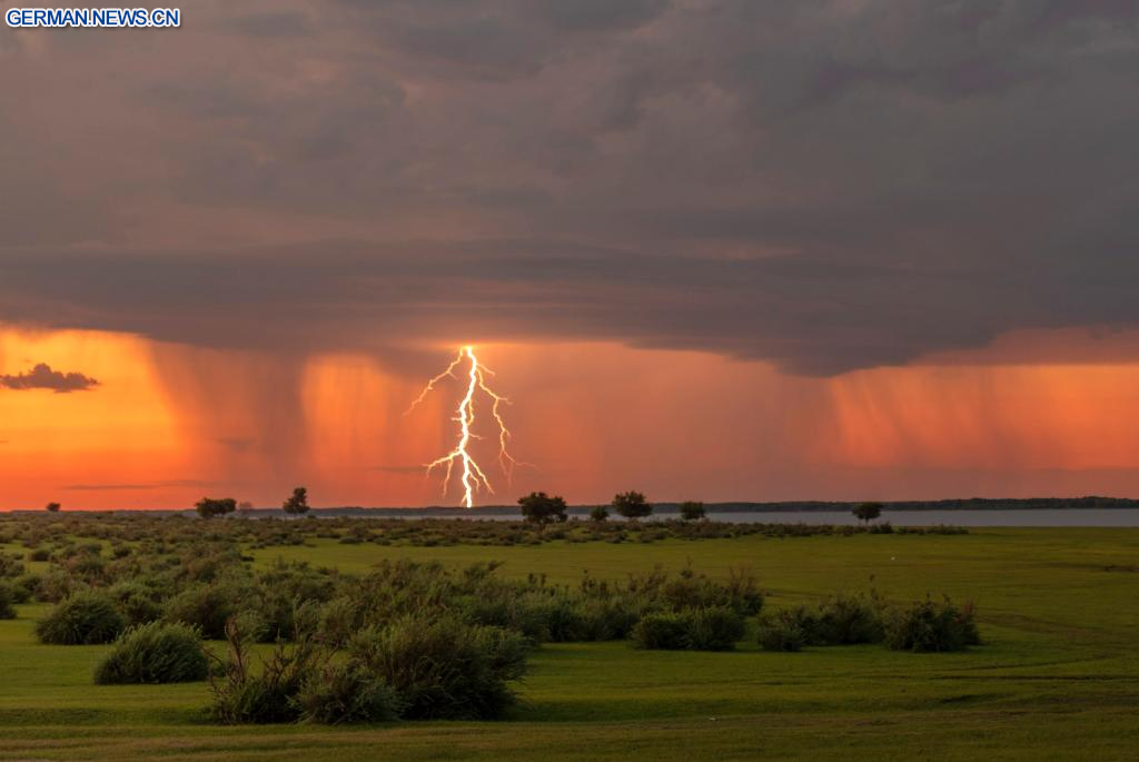 BEIJING, 5. August 2025 (Xinhuanet) -- Gewitter und Blitze sind im Mongolischen Autonomen Kreis Dorbod in der Stadt Daqing in der nordostchinesischen Provinz Heilongjiang abgebildet, 21. Juli 2025. (Foto von Liu Wei/Xinhua)