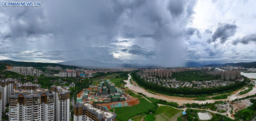 BEIJING, 5. August 2025 (Xinhuanet) -- Das Luftpanoramafoto zeigt die Stadtansicht im Regen in der Stadt Jinghong in der Autonomen Präfektur Xishuangbanna der Dai in der südwestchinesischen Provinz Yunnan, 7. Juli 2025. (Foto von Li Yunsheng/Xinhua)