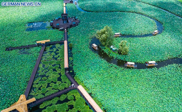 BEIJING, 6. August 2025 (Xinhua) -- Die Luftaufnahme einer Drohne zeigt einen Blick auf einen malerischen Lotosblumenteich in der Stadt Xinghua in der Provinz Jiangsu in Ostchina, 21. Juli 2025. (Foto von Zhou Shegen/Xinhua)