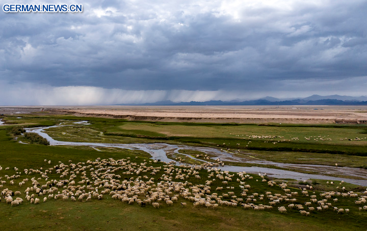 BEIJING, 6. August 2025 (Xinhua) -- Die Luftaufnahme einer Drohne zeigt Schafe beim Grasen auf einer Sommerweide vor einer Regenkulisse in der Ferne im Kasachischen Autonomen Kreis Aksay in der Provinz Gansu im Nordwesten Chinas, 12. Juli 2025. (Foto von Gao Hongshan/Xinhua)
