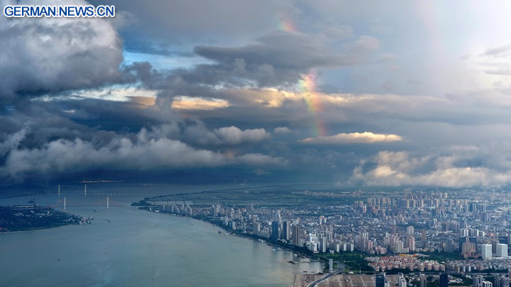 BEIJING, 6. August 2025 (Xinhua) -- Die Luftaufnahme einer Drohne zeigt einen Regenbogen über der Stadt Shantou in der Provinz Guangdong in Südchina, 30. Juli 2025. (Foto von Yao Jun/Xinhua)