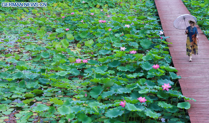 BEIJING, 6. August 2025 (Xinhua) -- Eine Touristin betrachtet Lotosblumen in einem botanischen Garten in Shijiazhuang in der Provinz Hebei in Nordchina, 7. Juli 2025. (Foto von Liang Zidong/Xinhua)